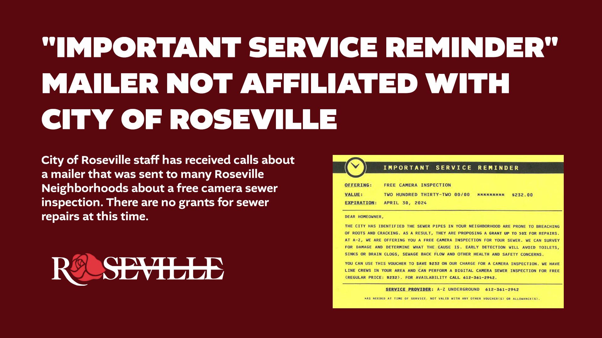 The City of Roseville has received calls about a mailer that was sent to many Roseville Neighborhoods about a free camera sewer inspection. The City is not affiliated with this messaging. There are no grants for sewer repairs at this time.